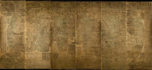 晚明時(shí)期天主教耶穌會(huì)東來(lái),以學(xué)識(shí)叩開古老中國(guó)的大門,掀起第一次西學(xué)東漸的浪潮。一五八四年(明萬(wàn)歷十二年),耶穌會(huì)教士利瑪竇結(jié)合中西地理知識(shí),在中國(guó)廣東繪制印行“世界地圖”——《山海輿地圖》。該圖建基于西方地理大發(fā)現(xiàn)所驗(yàn)證的“地球?qū)W說(shuō)”和“地圓說(shuō)”,對(duì)當(dāng)時(shí)的中國(guó)極有啟蒙意義,影響晚明中國(guó)士人制作出一批以大明疆域?yàn)橹行牡氖澜绲貓D。利瑪竇地圖原本如今很難考辨,今天傳世的是由之衍生出的一六〇二年李之藻刻本《坤輿萬(wàn)國(guó)全圖》。